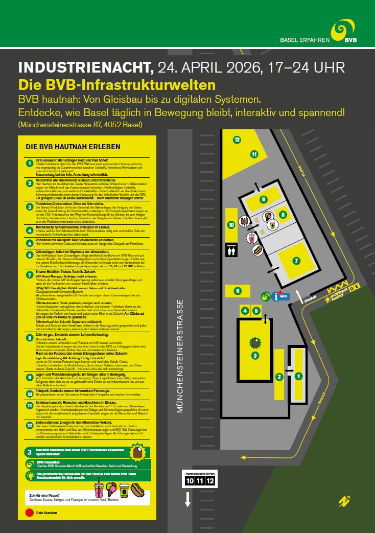 Wir öffnen in dieser Nacht ebenfalls unsere Tore und laden dazu ein den Geschäftsbereich Infrastruktur aus nächster Nähe kennenzulernen. Sie finden uns an der Münchensteinerstrasse 85 bzw. 87 in Basel.